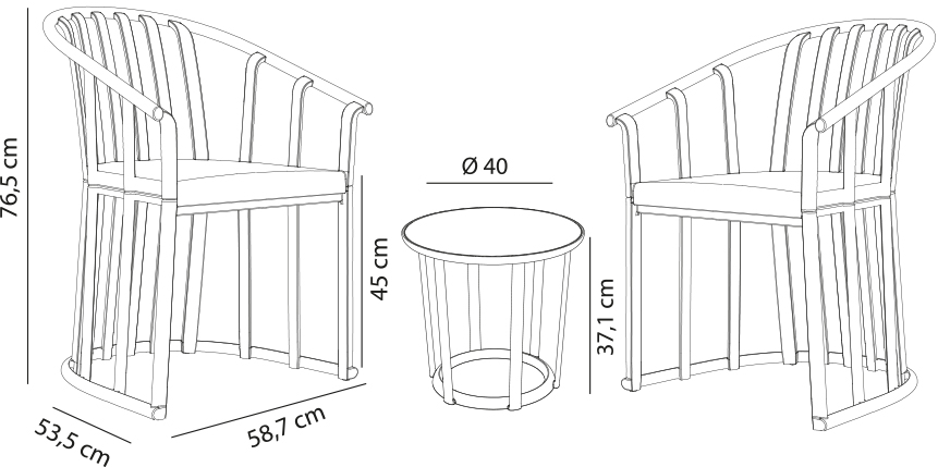 Set para uso interior y exterior, compuesto por 2 sillones y una mesa. Inyectado con fibra de vidrio y PP. Protección UV. Peso neto 16kg. Cojínes incluidos color Hazelnut de secado rápido Gravidry de 30 mm y 30 kg de densidad. Tapizado con tejido acrílico tintado en masa, funda con cremallera desenfundable y sujeción con cintas. Óptimo packaging.